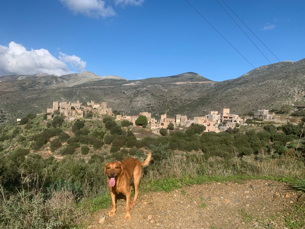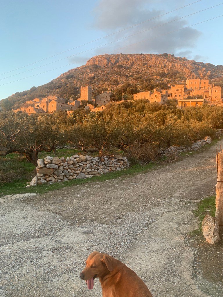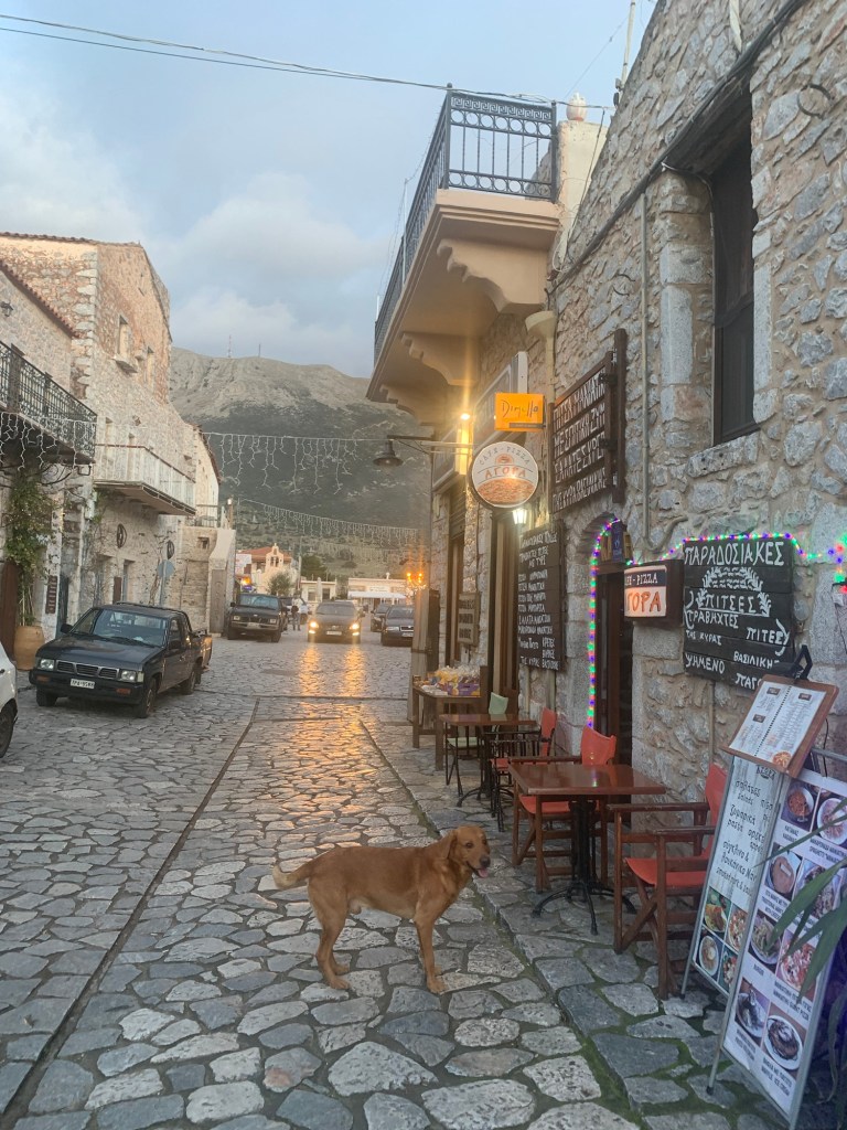 In the car park at Areopolis I met a Scottish guy, Tam. The car park permits vans to stay, and I had thought it a good place for one night. I needed a supermarket stock-up, and fancied a beer in one of the taverns. Tam had a 1998 ‘S’ reg motorhome which he shared with his three rescue dogs. We got on well, and after a chat around the vans we decided on finding a tavern, with the dogs of course. There was a good atmosphere in the town, which is much smaller than Gytheio but still is the biggest place for some way around. I’d guess it would be the last relatively quiet night before the Christmas festivities, with the school, which shared the car park, still in session, and many people still working until Friday lunchtime.