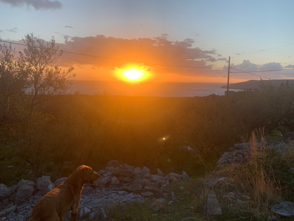 On my the third and last night in Kagio I realised that there was actually someone there other than me. I had seen a fishing boat go out on a couple of the mornings but not watched closely enough to see if the guy stayed in the village. I walked up and down the beach, as had become my habit, just as the sun went down, and as I got back to the van, the fishing guy arrived with an old wine bottle and two rather dirty shot glasses. It was vaguely Tsipouro, the spirit distilled from the residue of the grapes left in the wine-press. I managed to get away with only having two. We didn’t really speak, just acknowledged each other with a few grunts, but I was touched by the gesture.