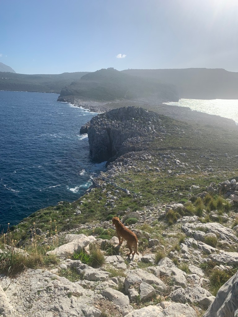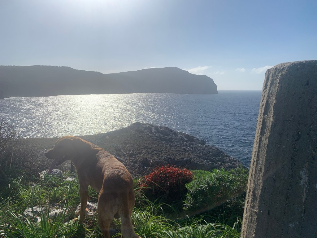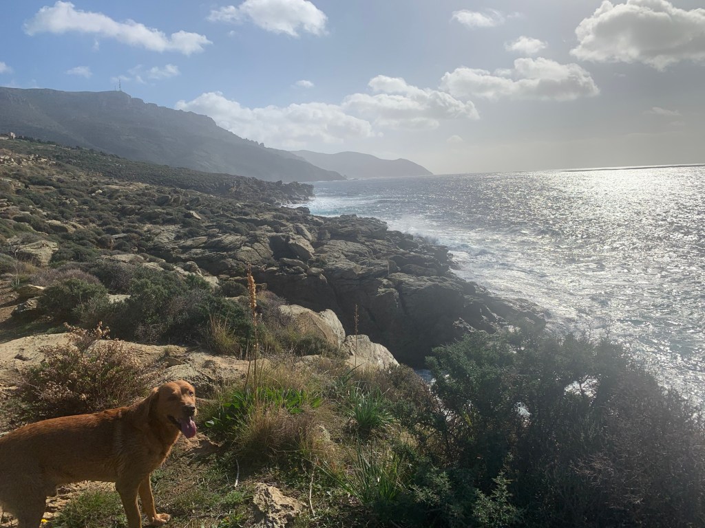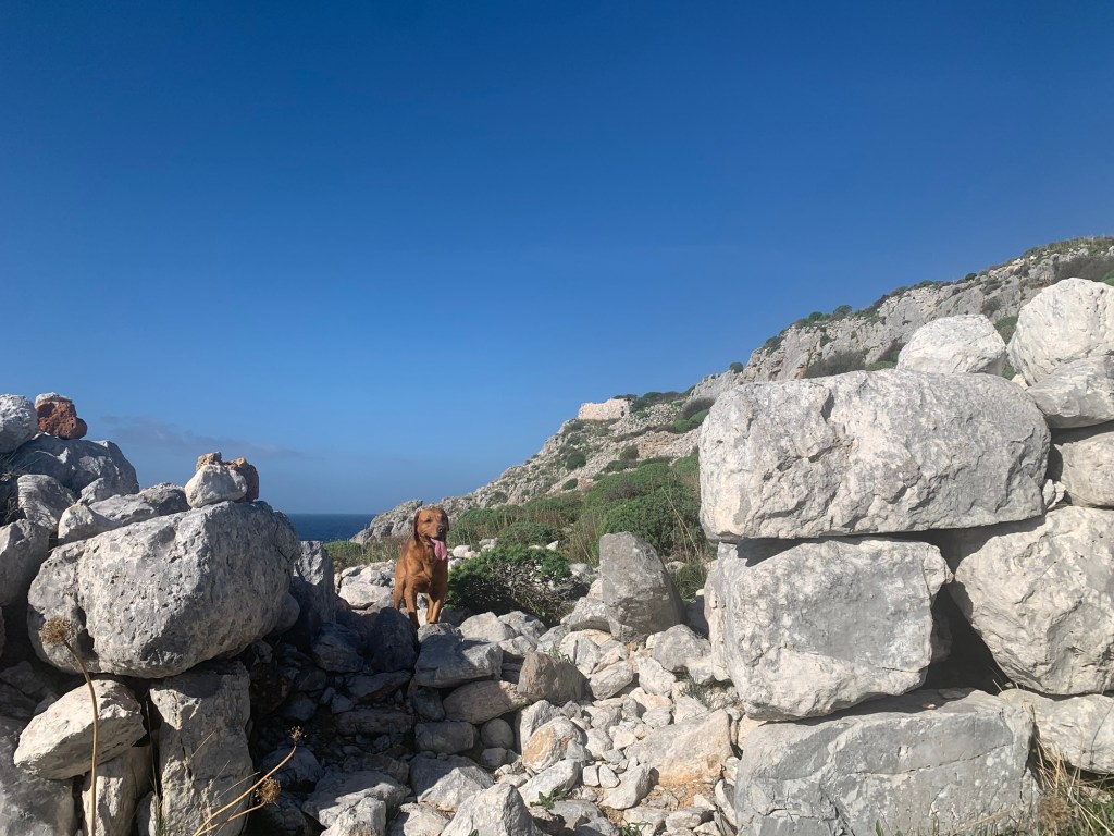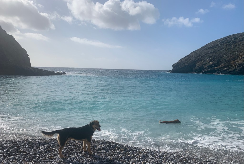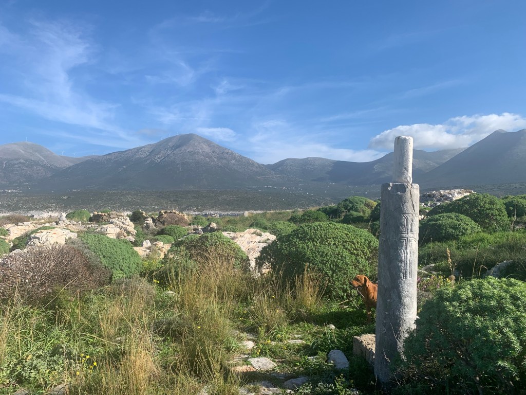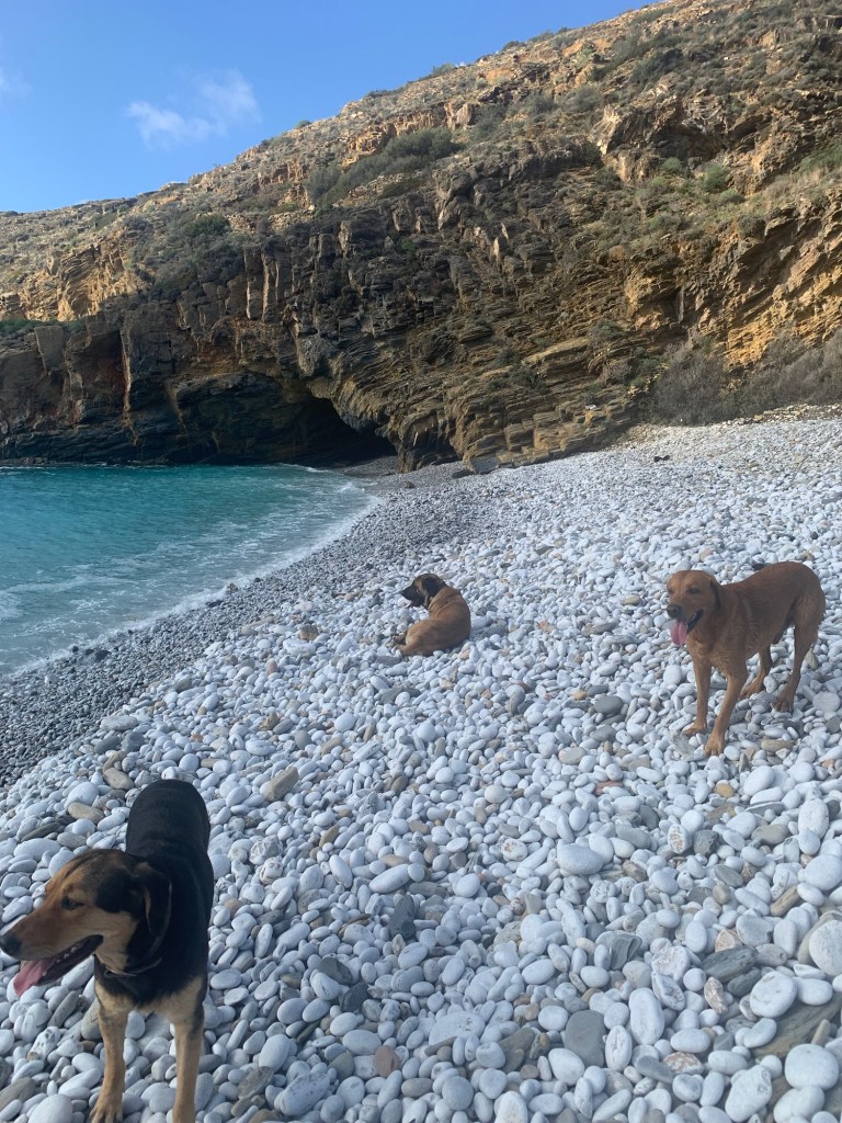 On Saturday Roja and I found a very unused path that descended to the three beaches that lie to the south west. Not long into the hike, barely out the village of Alika, we were joined by two other dogs; my bodyguards as one passing motorist stopped to say, as well as good wishes for the season. The other two dogs leave Roja to swim alone, too cold for them I expect.