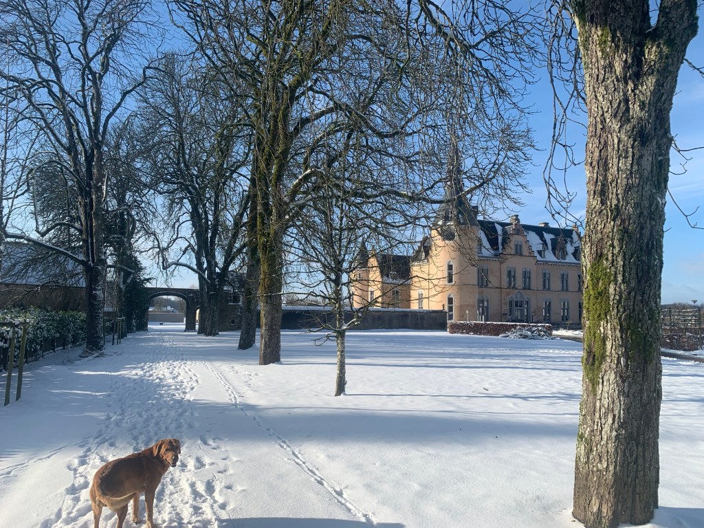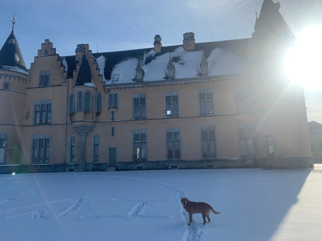 There’s about ten centimetres of snow here which fell yesterday morning. It then turned cold, several degrees below zero, so it’s dry and powdery, and clearly puts most local people in a really good mood. Almost everyone I see stops to chat, about happy topics, children are out playing in the snow, as there’s no school, and I found several adults, without children, playing similarly. I’m parked in the Chateau, and when I was out with Roja yesterday afternoon, a middle-aged woman spent more than an hour making large shapes in the snow.