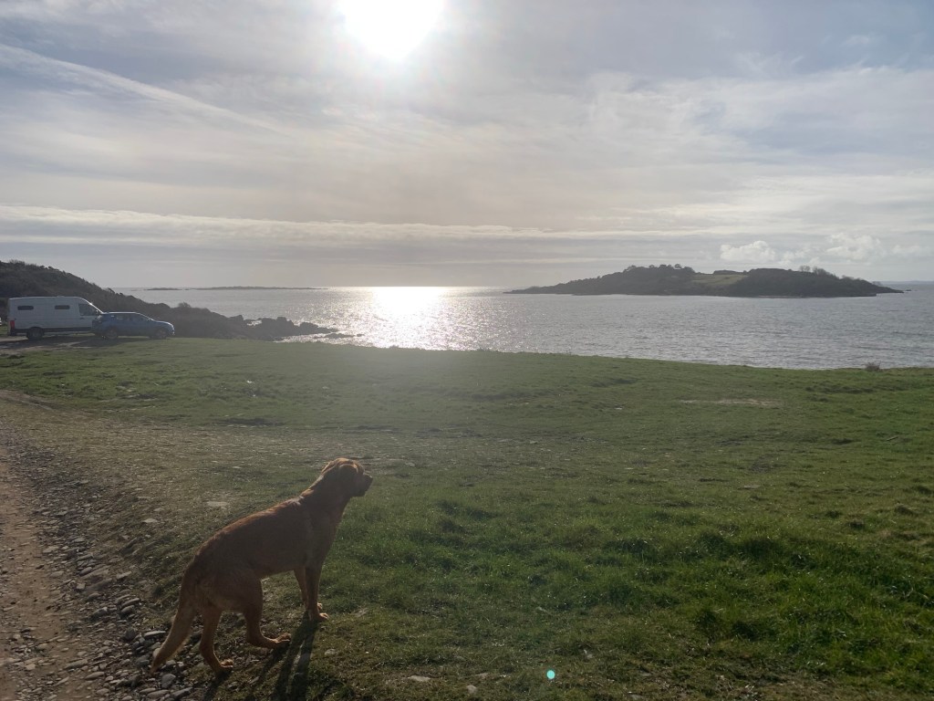 We moved on to Carrick Bay, which would make a wonderful stopover, but like most places along the coast, vans are not allowed. It’s half term, so there were a few families around, though the lady I got talking to on the way up to the viewpoint told me that this walk was the way she was celebrating her 74th birthday. And on such a great day, I could see why. I headed off across farmland, temporarily forgetting how ungraceful I am at getting over fences, and cut across to the sandy beach at Carrick, returning along the coastline.