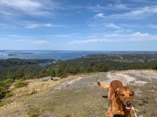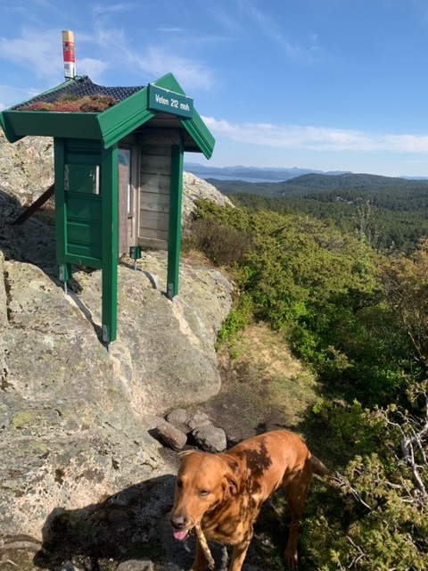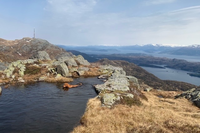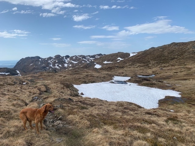 To celebrate such splendid mountain conditions, yesterday morning Roja and I repeated part of the hike we had undertaken the day before, ascending Kattnakken up the gravel path, this time the 400 metres a few minutes quicker, then found a different trail along the wide ridge, meandering around the remaining snow deposits, whose days are now numbered, and descended the path by the waterfall down to the car park.