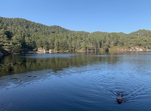 Later in the evening we walked around the lake, an excellent chance for Roja to cool off also. And this morning, we scaled a much steeper than expected path up to the Veten summit, so steep in one place that it had a permanent rope in place, for thirty metres or so. It gave excellent views on a splendid morning.