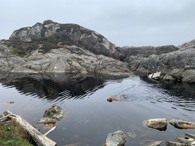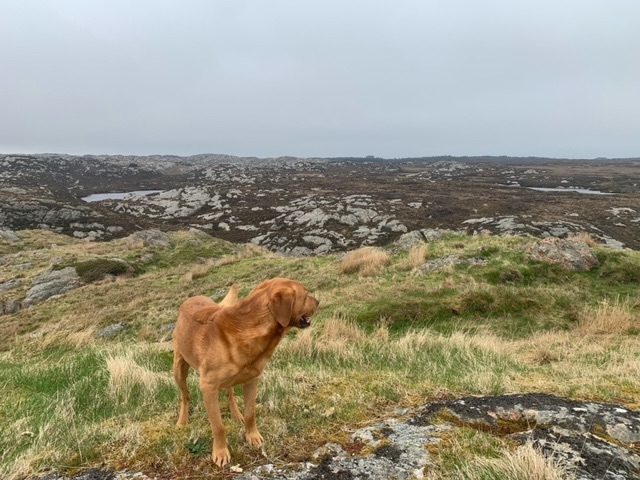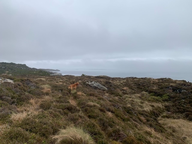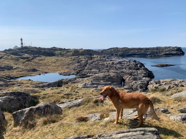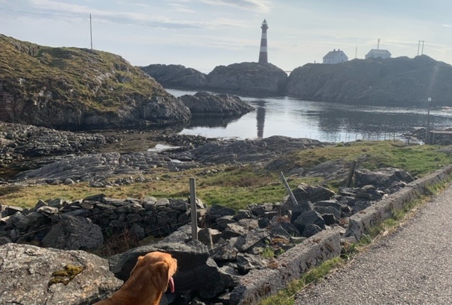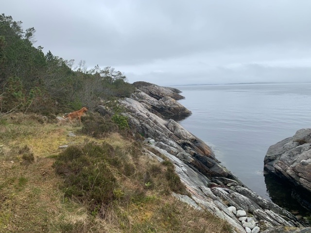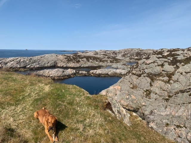 I headed to the far southwest corner of the island, close to the lighthouse, where there is parking for walkers. The island has a circular hike roughly around its edge, that I planned to do on Sunday. On the ferry the weather was so fine that Roja and I headed up on to the deck, where we got chatting to two women who had three dogs with them, a Shetland Sheepdog and two Red Setters. They were both teachers, and out to hike the island trail. I asked them about the teaching of English, which they both did to Primary School children, and they told me that it was a bit of a problem at the moment, in that they learn from school a bit, but mainly from the games they play on the internet. In the schoolyard, and socially to each other, they speak English. This is quite a new thing, just the last few years, and schools worry that their ability to speak and write in Norwegian may suffer.