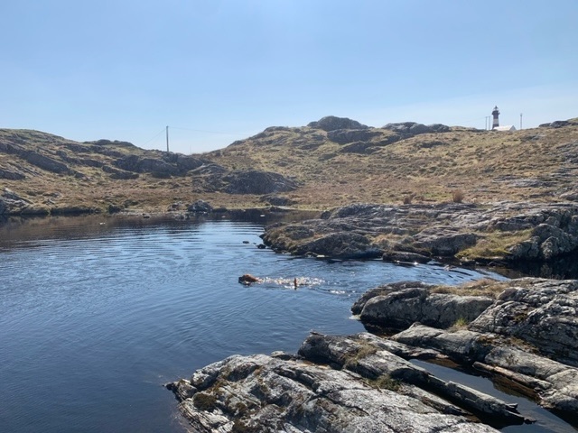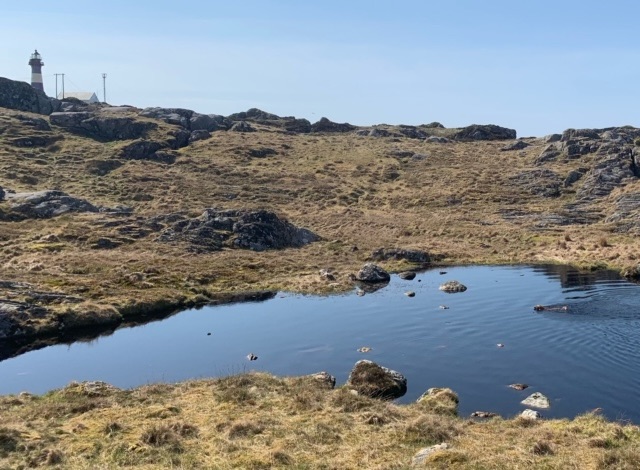 The Island of Fedje is the 170 nautical miles, or 315 kilometres from the north of Yell in the Shetland Islands. Those Bergonians with sailing boats often undertake the crossing in the summer. On Yell last summer I had texts from my cell phone provider telling me I was actually in Norway. I arrived on the island on Saturday morning in 24C with almost completely calm waters, unusual weather for the time of year. The ferry arrives to the island’s main village with its church, and a distillery the dominant buildings. This year the distillery’s whisky is six years old, and therefore can be sold. Until now it has only sold gin. The island is just 9 square kilometres, and has a permanent population of 330, but has more holiday homes for the people of Bergen than it has for its residents. It’s often windswept, but this weekend was calm and warm.