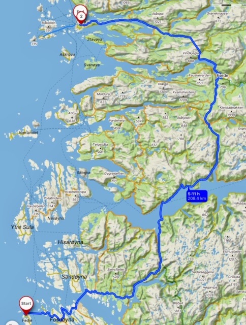 Entertained by the Leading interview with Nancy Pelosi on The Rest is Politics (which I can recommend..), we headed north. At the gaps provided by the ferries, I tried to contact the ferry company that operated out of Florø, but for a long time drew a blank. Most ferries are operated by Fjord1 and easy to find timetables and prices for, but not these. Eventually I discovered the reason, which was that the ferry that serves the route had recently been purchased by another, smaller company, and as yet, there was no online information for it. I made several telephone calls, and managed to get booked on the 8 pm crossing, though the guy, who was actually on his cell phone and on the ferry at the time, told me he couldn’t guarantee space. When I arrived at the quay, I was one of just two vehicles on the ferry, which would take about six vehicles.