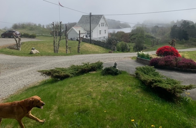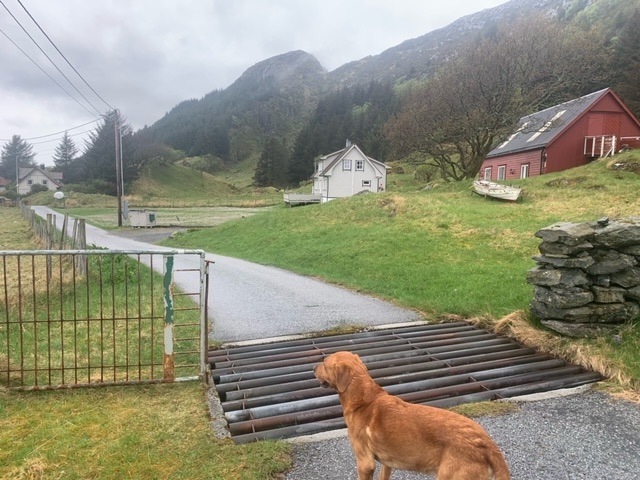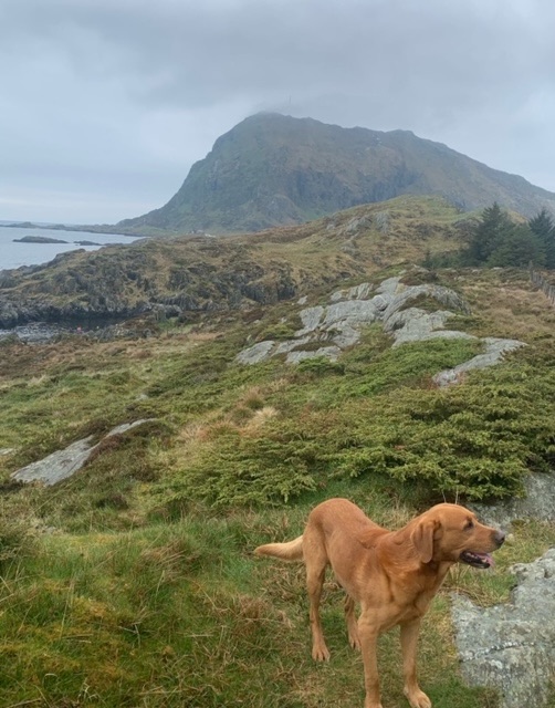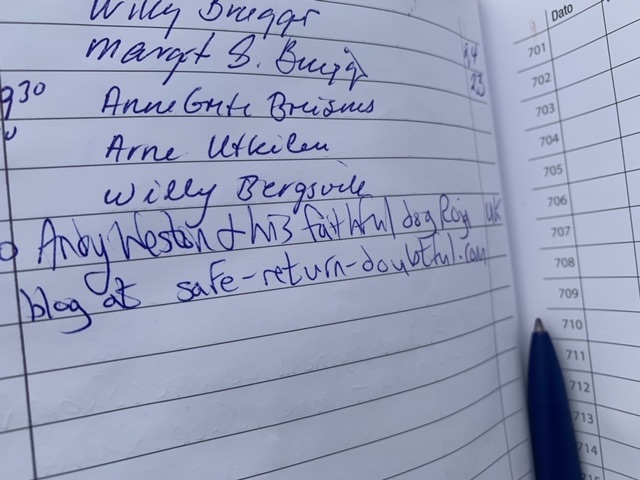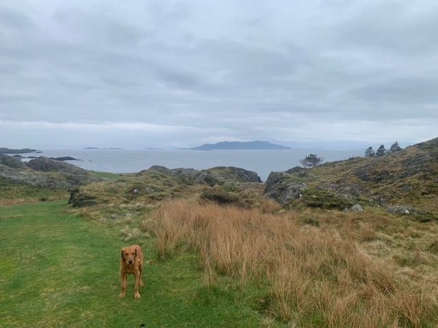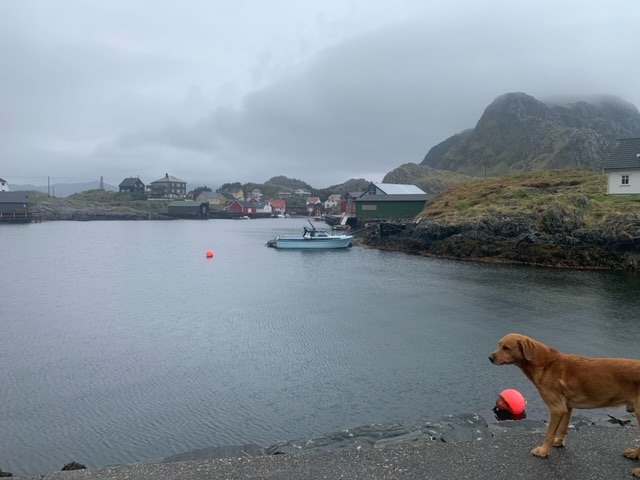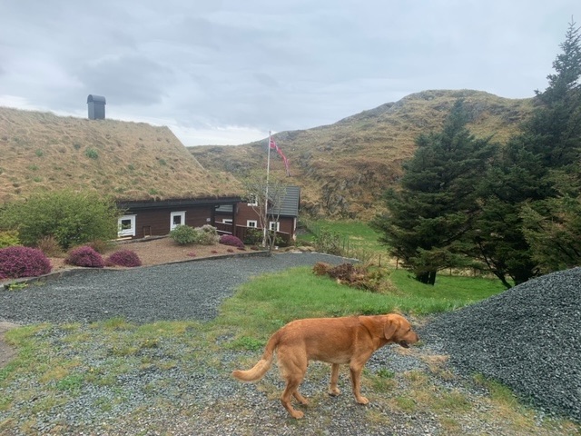 The most chatty has been a farmer, probably about the same age as myself, Tom. He was keen to know what breed Roja was, as was a keen dog person himself, and a believer that they should be off lead, as Roja was, as much as possible; the sheep, which he looks after, have lambs at present. He said though, that most people disagreed with him. The Scandinavians are very big on having dogs on the lead, I know in Denmark and Sweden it is actually the law. Tom was proud of his house, 147 years old, though he had moved here just 25 years ago. He told me quite a bit about the history of the island, as well as the wildlife, as we watched a pair of sea eagles hunting on the mountain above. I mentioned I had been in Shetland last summer, he said that the father of a friend of his, pointing me out the house, had sailed to Shetland in the war as part of the resistance against the Germans, taking escaped prisoners to safety. This wasn’t actually part of the famous Shetland Bus, which operated from further south, Bergen, but associated with it. Like many, he decried the dwindling population, and the inevitable increase in holiday homes.