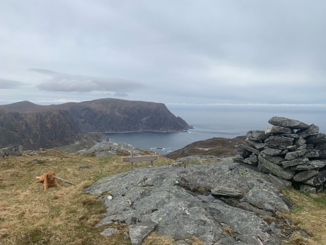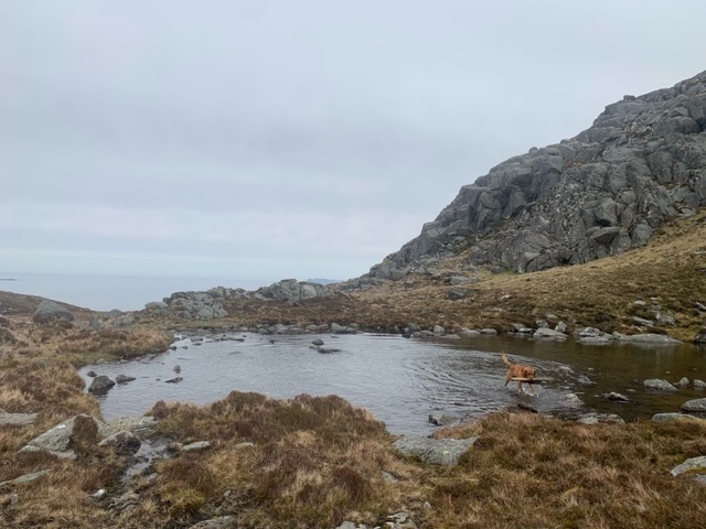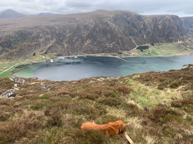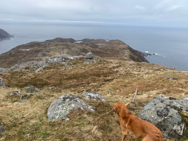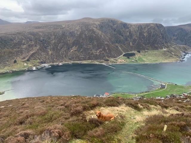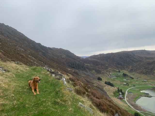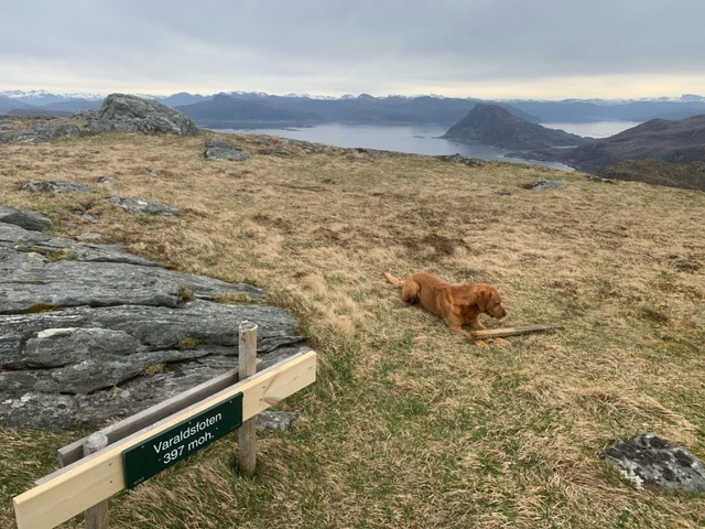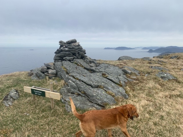 I am here for different reasons though, and this morning, Roja and I set off to get some perspective on the head of the Leikanger peninsula by gaining a bit of height. That involved walking round the half-moon of the bay, about a mile, before branching off on a narrow and steep path that diagonally scales the wall of mountain that curtains the bay. That wall is about 300 metres high, and having gained that initial elevation, there is a flatter expanse of rocky butts and small lakes or lochans. One peak dominates this peninsula, Varaldsfoten, another twenty minutes of steady climbing to the peak at 398 metres, immediately rewarded by a panoramic view, shown in the short documentary below..