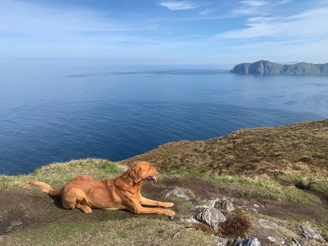 This morning the sun was warm with unbroken cloud. When we returned for lunch I had to arrange some shade for my Cumbrian dog, but more cloud rolled in, and the breeze got up a bit like yesterday, very coastal sort of weather similar to the islands of west Scotland, never warmer than 20-24C, always very pleasant, and with the amount of daylight it remains warmer longer than in Europe to the south. Just after 8, Roja and I took our evening walk down to the beach. Almost warm enough for a swim.. for me I mean, Roja was in of course.