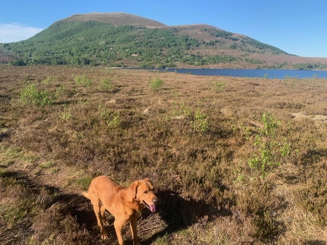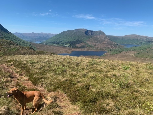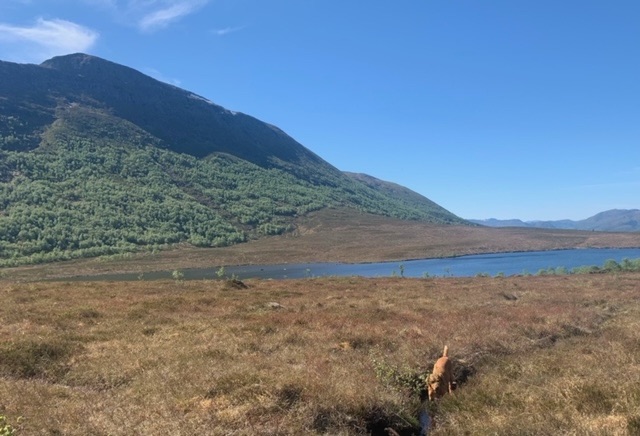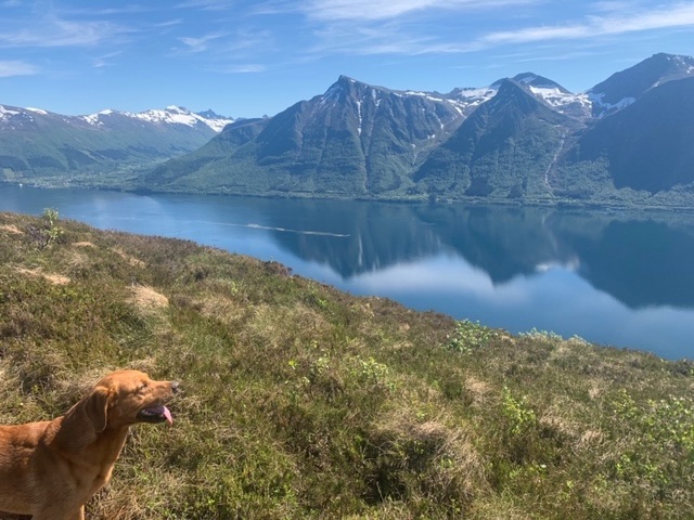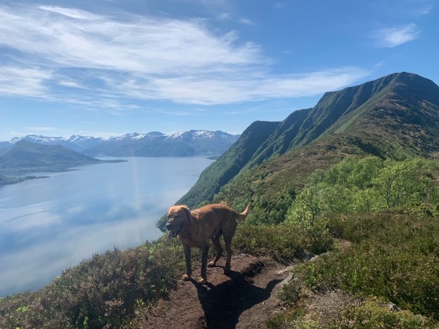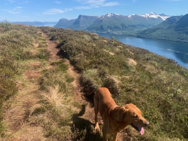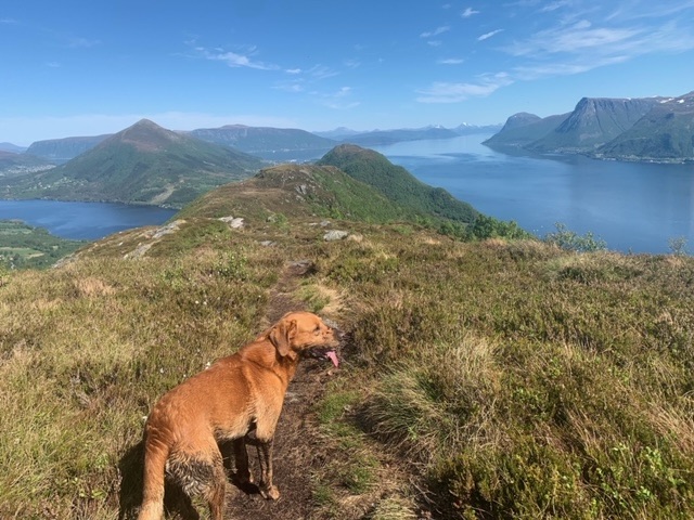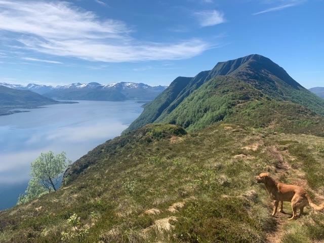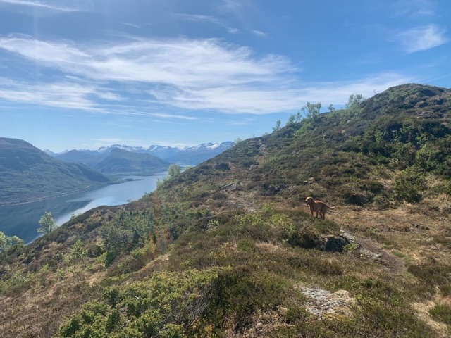 I had a route in mind that I wanted to do today, but had some concern with the hot weather. But by mid-morning a decent breeze arrived, and there is plenty of boggy pools and puddles to keep Roja hydrated. In the end, we got further than I had hoped, and took in two peaks, Kvamstua at 429 metres, and Høgenausa at 489 metres. Having left the bog, climbed a steep 270 metres or so, the ridge was spectacular, the best hiking so far this course. We passed two young women coming the other way, with a young black labrador also off the lead, which is very rare here in Norway. They had added a day to the long weekend holiday and started out early. We agreed, that so long as the dogs can be trusted, they can be difficult to manage on steep ground. They key is of course, that the dog is well disciplined, and doesn’t tear around disturbing ground nesting birds, or being a concern with cliffs around. On the ridge, the ground to the south-east drops almost as steeply as a cliff to the sea.