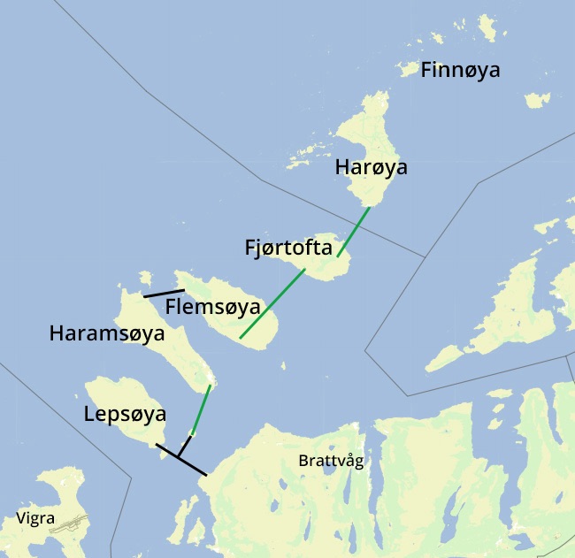 Late in 2022 the Nordøyene island group lying to the northwest of Ålesund were connected together by a tunnel and bridge system, called the Nordøyvegen. Previously connection had been by ferry.