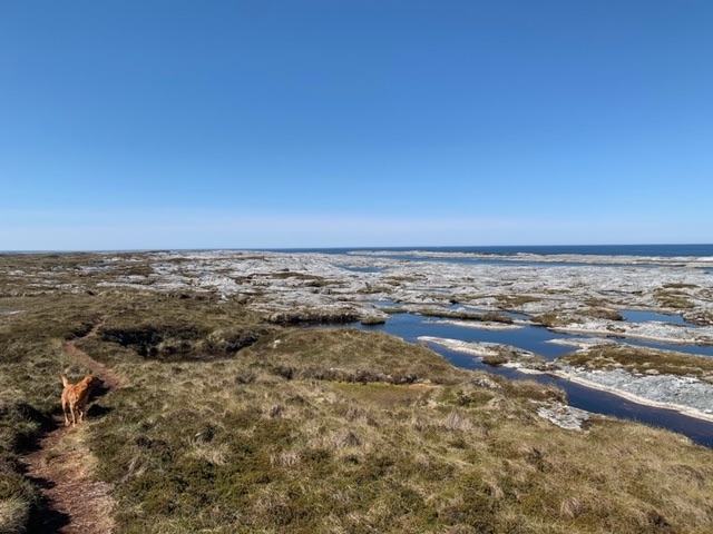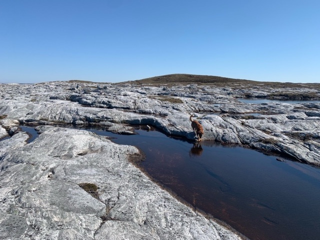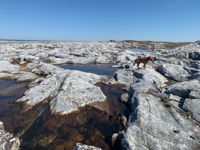 These are great conditions for outdoor activity, about as warm as I would want it. This rocky headland, provides spectacular viewing in a storm or with a high tide, but also on a day like today, when the rock is dry and it’s easier to walk on them. I researched the best possible route to take this landscape on last night, and found a trail that wove its way in between the rock pools, though Roja obviously doesn’t bother about them and simply swims across, to get to an isolated and wild viewpoint. Red dots on the rocks mark the way, otherwise it would be very slow going indeed, with lots of backtracking.