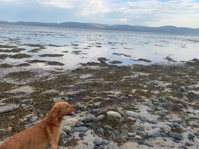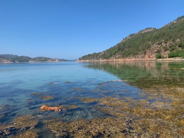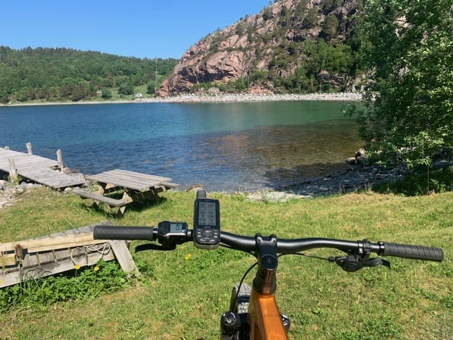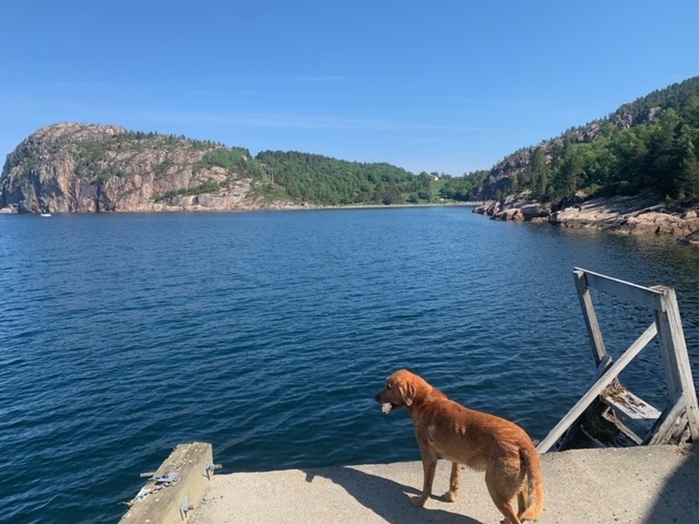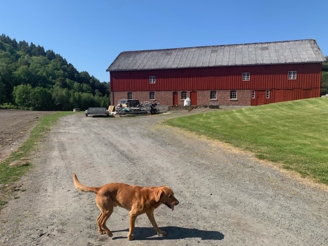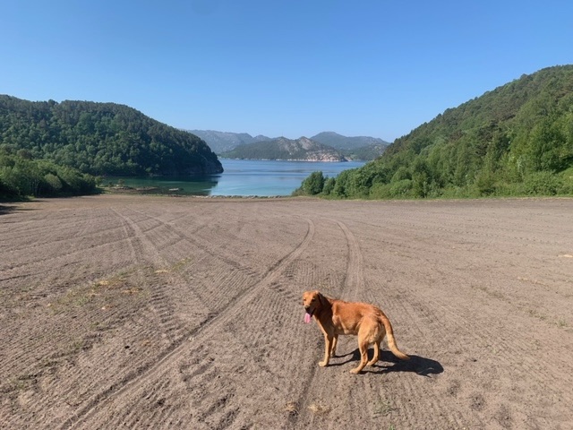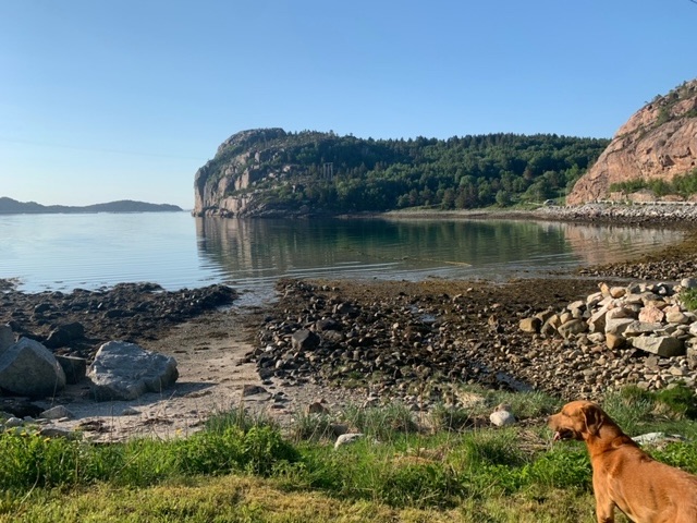 The heat is growing, as it tends to in a heatwave. I had a bit of shelter from the mountain behind me at the bay, but it got up to 27C on Saturday afternoon. Sunday was as warm, but with a breeze, though both nights went no lower than 20C. Consequently Roja has been doing a bit less. He really isn’t a fan of this sort of heat. We walked across to the neighbouring bay at Moldtun on Saturday morning, and were only out for 90 minutes or so. I got talking to the farmer whose land we needed to cross to access the bay, initially just to check that it was okay. In order to survive as a farmer these days, he uses the huge house only periodically during the year. He rents some fields out, farms some, and works labouring in Trondheim, an hour away. In the winter, he fishes. Like many across Europe at the moment, he is hammered by the increase in living costs, inflation has been high in Norway, and the currency has struggled against the Danish Kroner and the Euro. He wanted to hear more about my travelling, and his wife brought us tea. It turned out he had served for NATO in Bosnia in 1994 and 1995.