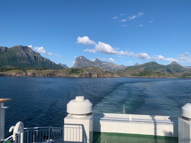 Yesterday was a three ferry day, the first being to return from Onøya and Lurøya to the mainland, a forty minute journey that returned us to Stokkvagen where we had left on Monday. From there it was a twenty kilometre drive through spectacular mountain scenery to Kilboghavn where there is an hour’s ferry crossing to Jektvik. Both the incoming and outgoing ships were full of motorhomes. It was a Friday, and with excellent weather, these were mainly Norwegians away for the weekend. I just hoped they weren’t headed where I was.