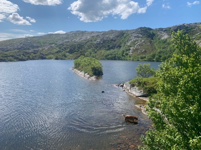 I met no one, except at the lake between hills on our return, where there was a couple swimming with their young daughter. We spoke for a while, as they were residents here, and they helped me with a route for tomorrow. The guy was a Liverpool football supporter also, and made annual trips to watch games there. I asked them about the bank card, and they knew the person, saying that she was up on the mountain right now. They will return the card to her, but she has been incredibly lucky that in such a wilderness someone found the card, off track as well.