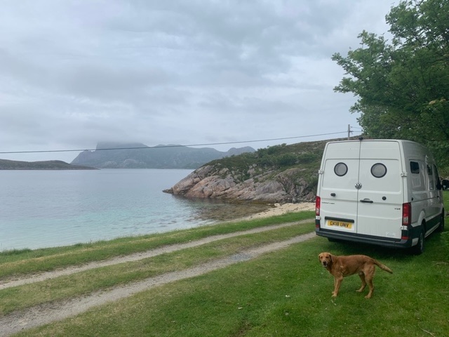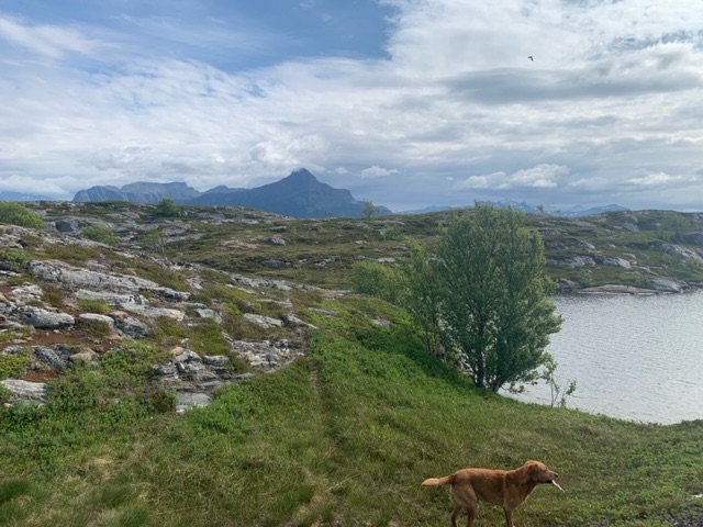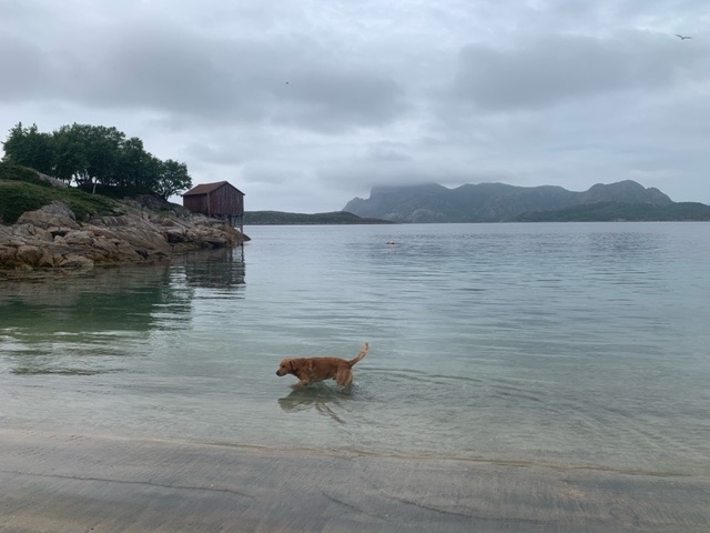 In the late afternoon I crossed to the island of Gjerøya, the next one to the north in the chain, then drove the six kilometres to the north of the island where Anders, the farmer from the island that I had met on the mountain yesterday, had recommended a place to overnight. It entailed a very rough road for a couple of kilometres, but emerged from the trees to a sandy beach in a magnificent setting.