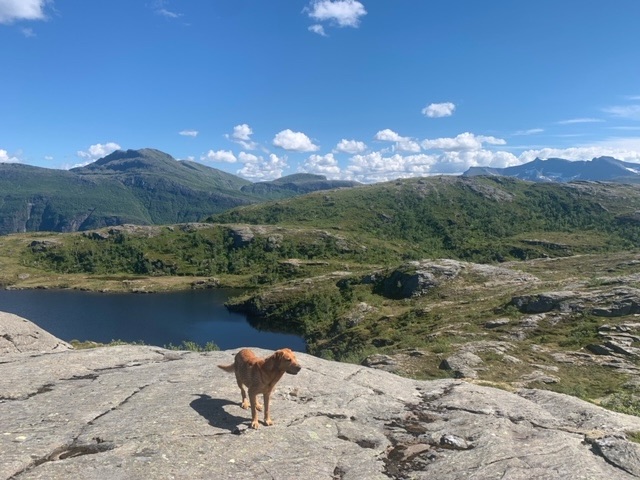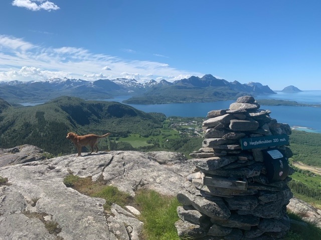 The weather remains fine, even hot yesterday and today, up around 26C. There is some rain in the forecast later in the week, but there has been in recent weeks also, and it has never materialised. With that in mind, I started the hike up to Høgfjellknubben just after 10 am, with most of the 350 metre ascent still in shadow. The trail is in the trees until above 300 metres, but on emerging from them, the view is amazing.