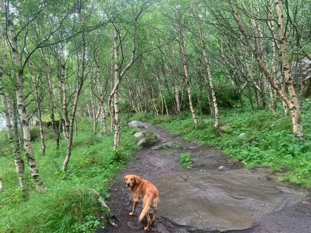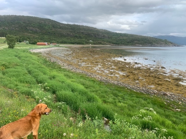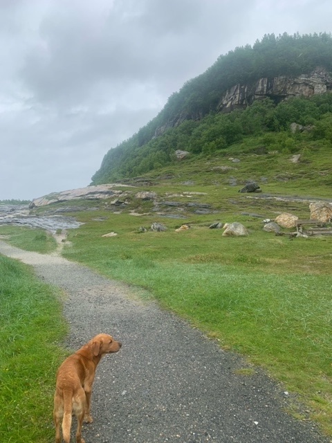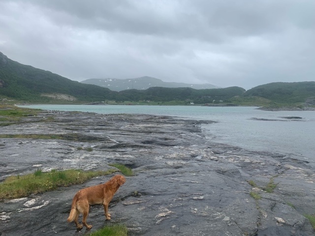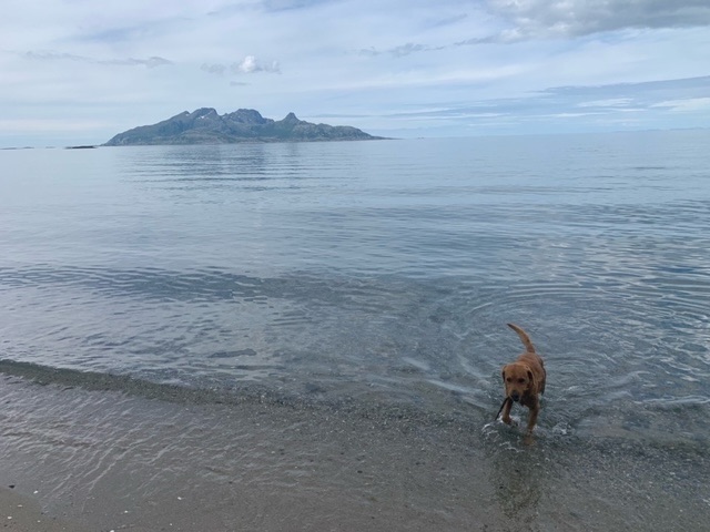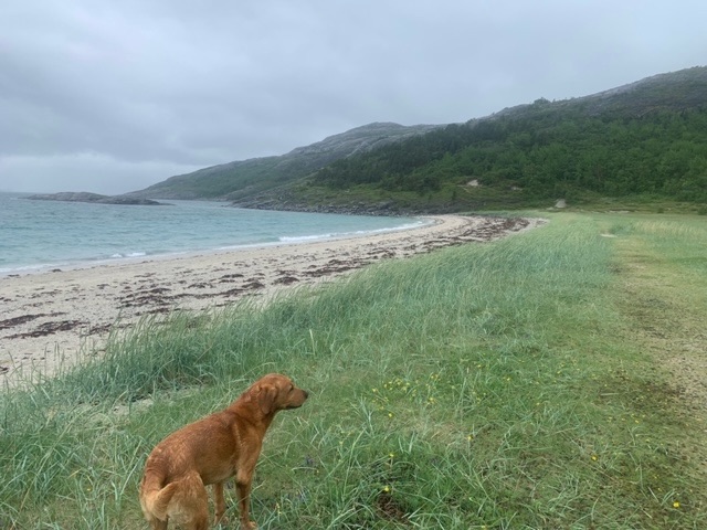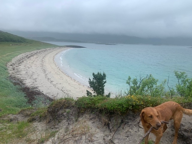 This morning was a repeat of yesterday, the drumming of the rain on the roof, another book, 11 am and Roja restless. This time we headed down to Mjelde beach, where we had been the day we arrived, and like yesterday, saw nobody.