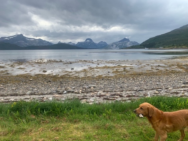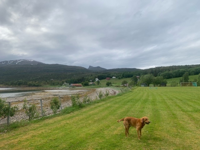 It is a fantastic place to spend a few days, and as with many Norwegian villages, the community maintains an area for visitors. For such a small place, Styrkesnes has a football pitch and sports area, with a sauna and barbeque area, a pit toilet, and seating. The view across the fjord is quite arresting, across to the jagged peaks of Sjunkhatten National Park. As I write it is a humid evening, 16C, with a hint of rain in the air, to come later no doubt, no mosquitoes, but a few mygs as the Norwegians call them, or midges as we do.