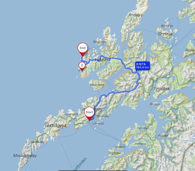 I drove north immediately, 30 kilometers in half an hour to Fiskebøl and took the half hour ferry to Melbu on the island of Hadseløya, not quite the Vesterålen Islands, in fact surprisingly flat compared to its neighbours either side. I then continued an hour or so vaguely northwest, though that entailed going round a fjord, as often in Norway, to the island of Langøya, which is one of the Vesterålen islands, the west most. The amount of traffic dropped significantly. There was the odd motorhome and campervan but nothing like the Lofoten coast. I was aiming for a group of mountains in the south of the island, just south of the town of Straume, and found a hiking car park for the night at about 6 pm.