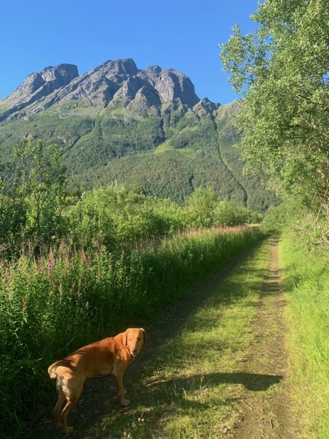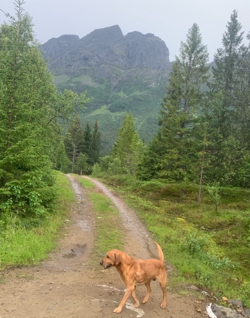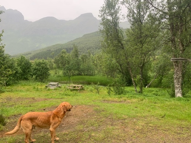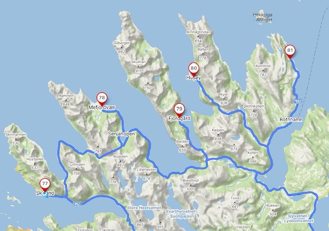 I’m on the southwest most of them, the little finger if you will, at Skaland, where I have found a good place to stop, next to a hike I hope to do tomorrow. Today has been wet, but tomorrow looks drier, important when the trails above about 150 metres are mainly on rock, as it can be slippery.