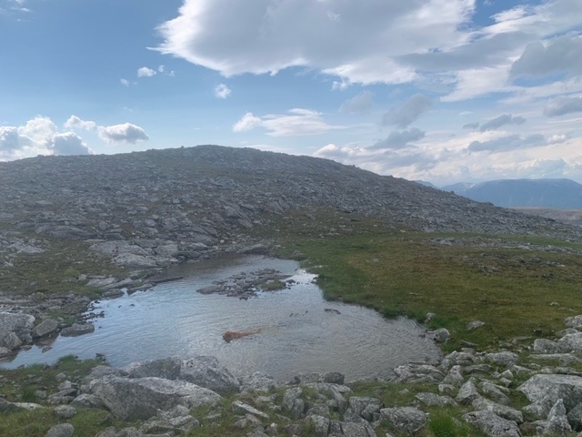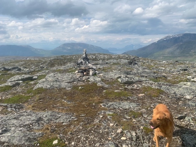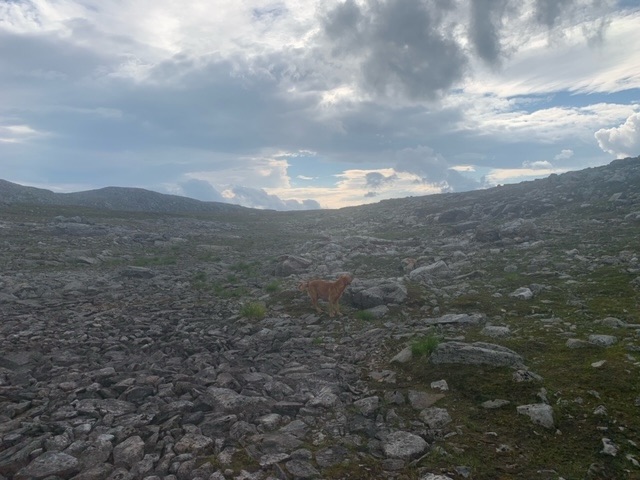 An initial trudge through boggy flat land, which would have been much more unpleasant had there been much rain, was rewarded by gaining 300 metres or so to a few rocky dumplings, bluffs and wide saddles, all with panoramic views; most spectacularly to the south, the Lyngen Alps. Malingsfjellet was my aim, at 734 metres, rising 50 metres or so more than its neighbours.