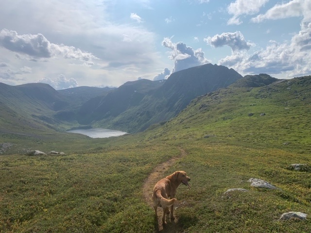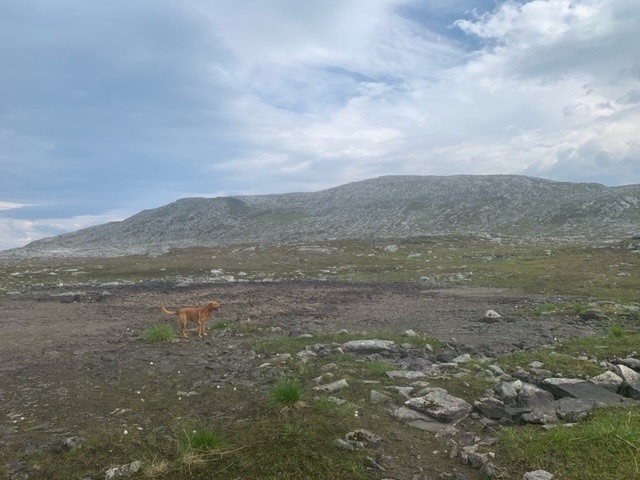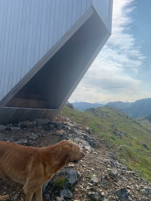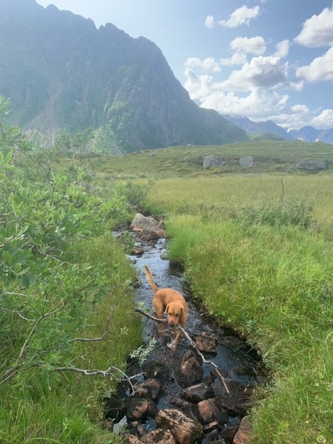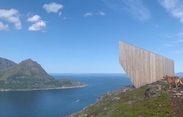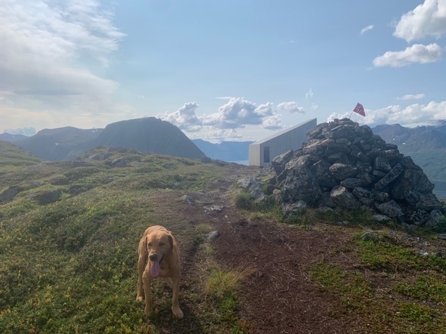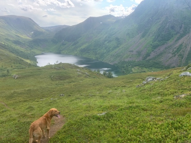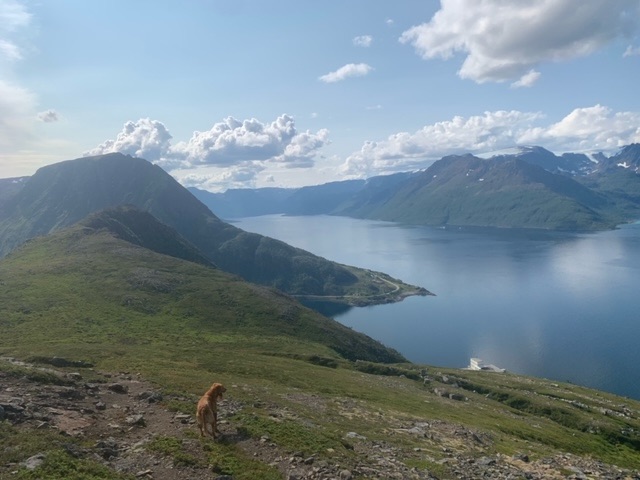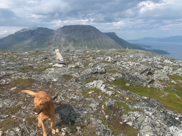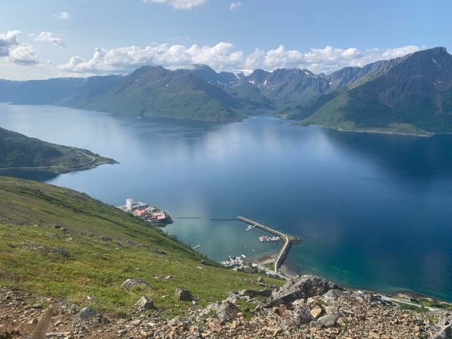 That plan was to get up to the ridge above the town and its peak, Øksfjordfjellet, at 372 metres. The weather in the last two days has returned to the heatwave conditions of the last couple of weeks, in fact yesterday, the humidity was high also, and at midnight it was still 20C. Fortunately, my homemade mosquito net for the side door works really well, so we could sleep with the door open to help stay cool. There were a few brief thundery showers and today was a bit cooler, in the mid twenties, but the weather isn’t due to break properly until Sunday afternoon.