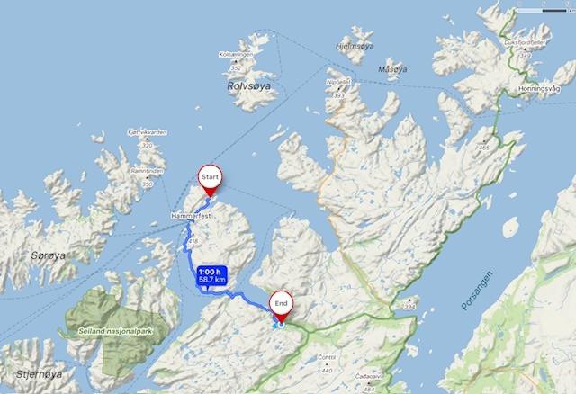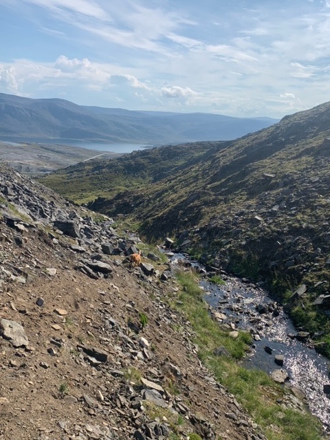 The ascent was a steep one via a gorge, steep but short, and it emerged to two lakes. I then took a route up on to the highest points (around 400 metres) that made a wide circle of about four kilometres. With the views to the west out over Sørøya and Seiland, where I have been for the last few weeks, it was a memorable hiking experience.
