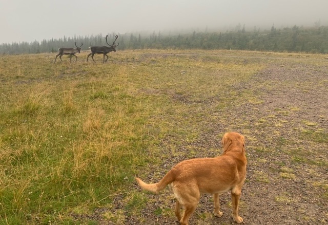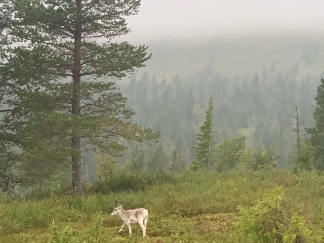 The space is ideal for campervans and motorhomes. I’ve been there twice now and it’s difficult to imagine it busy, as there’s so much room. It has a good view of the surrounding mountains and forest, and from its 450 metre altitude a few across the National Park also. Reindeer are used to visitors here, and it seems they get fed also, as they are not bothered about approaching people and even dogs.