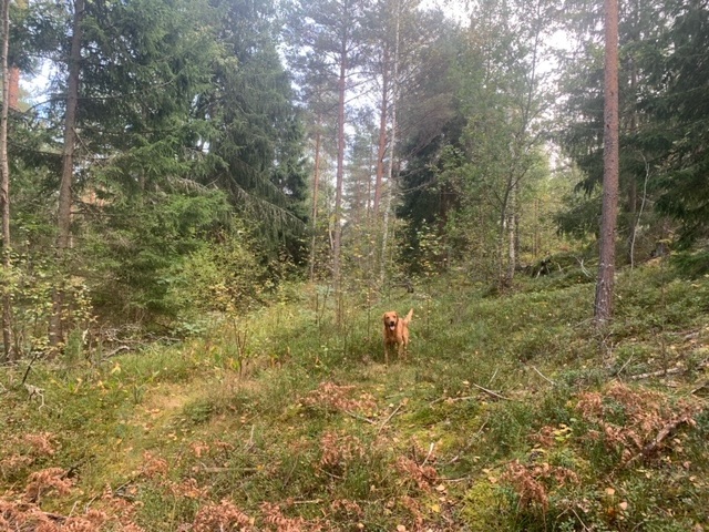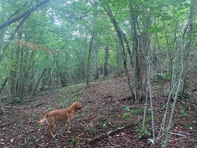 We took an hour out in the early evening, which became two. I’ve had the habit in the last few days of taking interesting deviations, most likely deer trods rather than paths, and sometimes having to battle through the forest off-piste when they fizzle out. It’s fallow deer here, and there are plenty of them, not easy to see at first, but if Roja is staring at something, I adjust my focus accordingly, stay still as he does, and usually I spot them also.