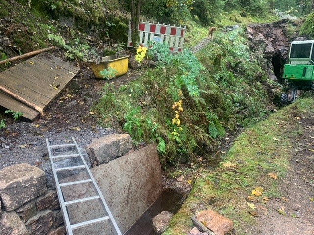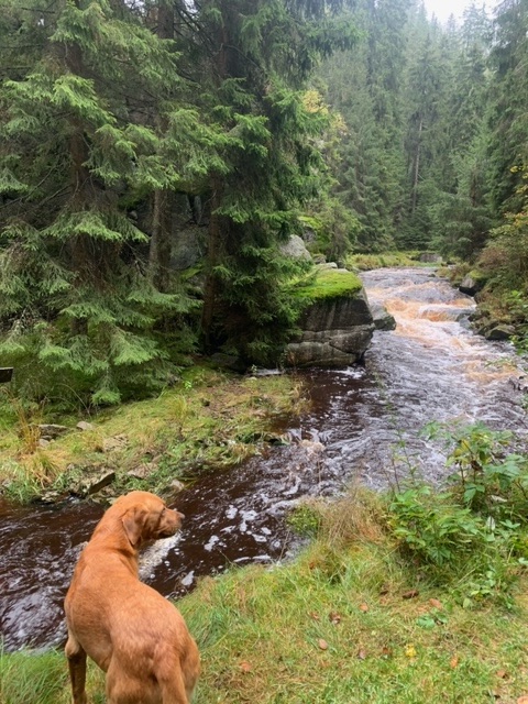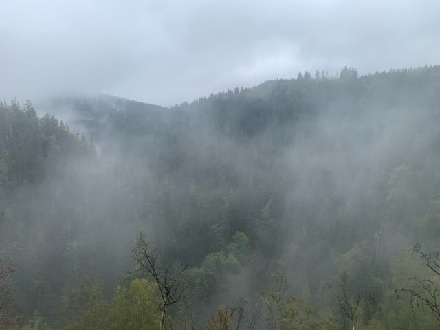 Below the Katzenstein, the now decapitated black cat mountain, is the valley of the Schwarze Pockau river, usually just called Schwarzwassertal, which also gives its name to the nature reserve which covers the surrounding 25 square kilometres. It is one of the most popular of all German low mountain valleys, but not so much this weekend, as a steady drizzle has followed the heavy rain of yesterday, with a maximum temperature today of only 8C.