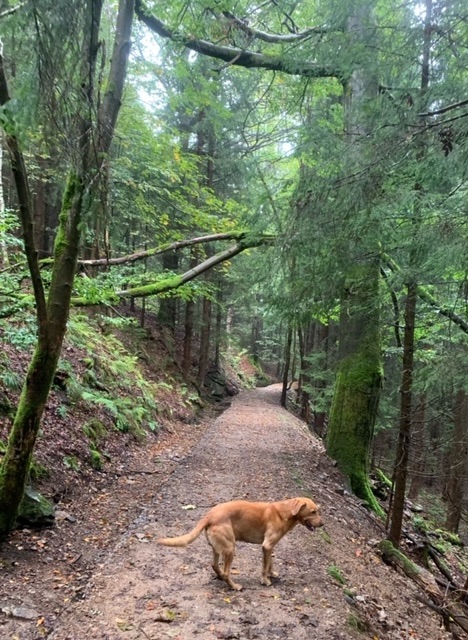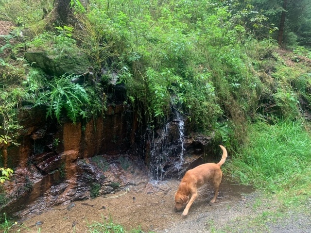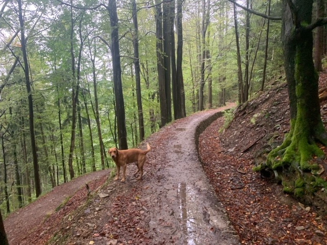 Returning along the watercourse above the river in the forest was more peaceful. The trees give an aura of contentedness on these wet days.