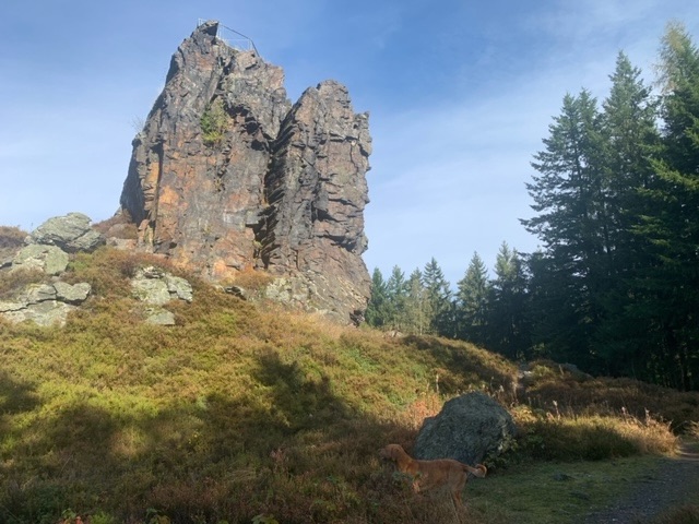 This section of the eastern Harz is called the Elster mountains, and is famous as the rock columns resemble a ruined castle, and in wartime over the years have actually been mistaken for a castle. These days they are very popular with climbers, but also hikers as they provide an excellent viewpoint. The quartz ridge, with a bed of slate, is in effect a wall that continues for several kilometres. It has been a protected area since 1907 though was still threatened with quarrying during the subsequent years.