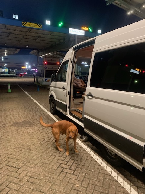 We had a couple of hours out on the hills with the dogs in the snow, before I continued south to Poole, to catch up with my old cricketing buddy, Joe. From there it was just an hour to Portsmouth ferry terminal and the night boat to Caen, perfect timing for a good night’s sleep in the van before docking at 7:15 am.