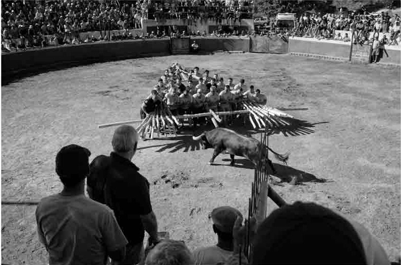 The forcão is held by a team of thirty men. One or two men hold the rabicho. From this control position, the rabicheiro, or rabiador, shouts directions to the team. He directs the rotation of the forcão to always face the bull. He also raises or lowers the rabicho to help the team. First, to attract the animal’s attention, the men shout while tilting the forcão up and down. Then they will continue tilting it up or down, to prevent the bull from either jumping over or sliding under the prongs. Ultimately, they want to lock the bull’s horns in the prongs of the apparatus. Once in this locked position, depending on the relative skill and strength of the bull versus the Forcãoteam, the latter will try to push forward and maneuver the forcão to force the animal to step back, or the bull will vigorously charge forward and force the team to adopt a controlled retreat. Either outcome represents a success for the capeia team.