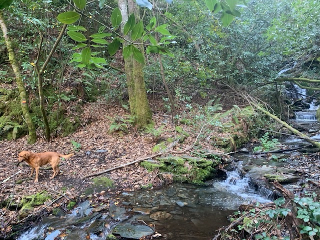 This morning, Saturday, we followed the trail as it descended a hundred metres in altitude to the village, then meandered off around the surrounding hills going up one river valley and descending another. In the valley it was still icy at 11 am, so the rock was potentially treacherous, and made for slow going, along with the fallen trees and branches of winter that won’t be cleared until hiking properly restarts in a couple of months. I was out for three hours, which is enough on a busy Saturday of European rugby, and will complete the remaining part to the trail tomorrow morning.