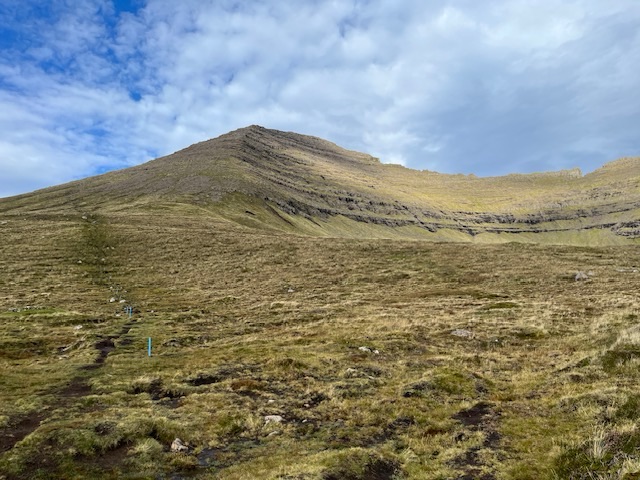 This trail goes on to Cape Enniberg just a couple of kilometres after the peak, the northernmost point of the Faroe Islands, where there is some ruined farm buildings from the sixteenth century and a 756 metre cliff and drop to the sea. It is one of the highest promontories in the world. I’m not good at such places on the calmest of days though, and certainly not today with 60 mph gusts..