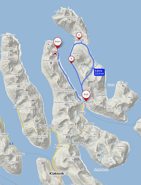 From here I took the steep trail up above the town towards the peak of Villingadalsfjall (above), though only up to 500 metres, as the wind was still strong. That amount of height though, gave tremendous views.
