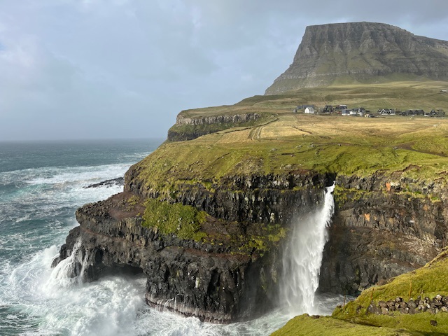 The road around the west of Vágar ends at the tiny village of Gásadalur, nestled into an amphitheatre of Árnafjall mountain (722 metres), and with a waterfall, Skarðsáfossur, that descends directly to the sea. It is used on screensavers throughout the world. Gásadalur is a farming village, though these days most of the houses are rented out to tourists.