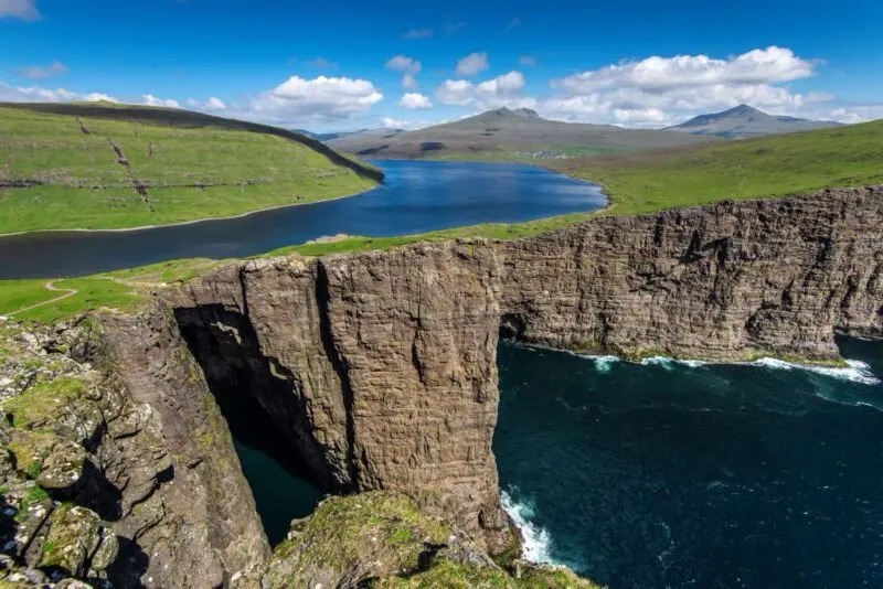 From Gásadalur I drove back past the airport to the town of Miðvágur from where the hiking trail to Trælanípa departs. Trælanípa Cliff is one of the most renowned sights in the Faroes.