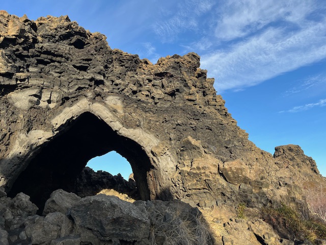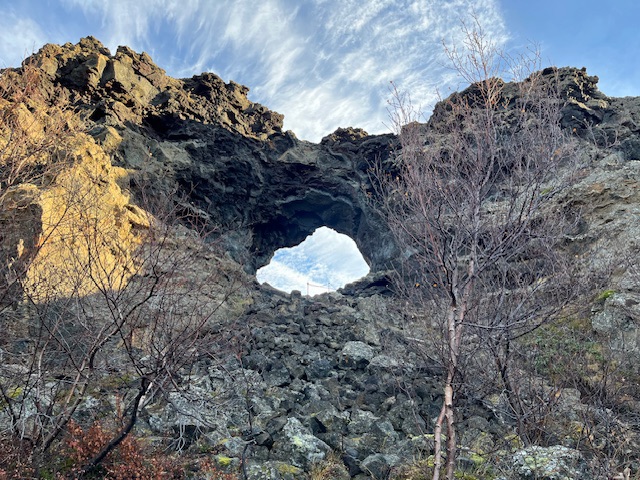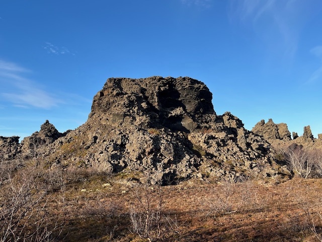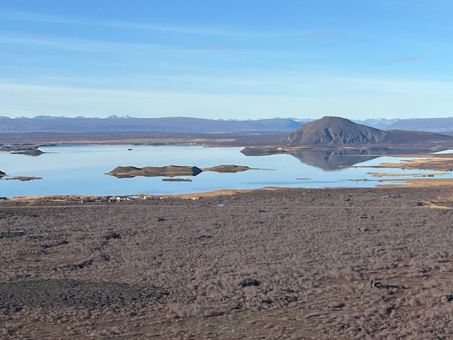 I drove fifty kilometres to Mývatn lake this morning before breakfast, giving the van a chance to warm up before taking breakfast. Mývatn is a shallow lake situated in an area of active volcanism that has a unique ecosystem that provide a habitat for a variety of waterbirds, though many have left for the winter. It’s still a good time to visit though, as with the warmer weather come black flies also. I was keen to hike a circuit in the Dimmuborgir Lava Fields and up the rim of the Hverfjall volcano.