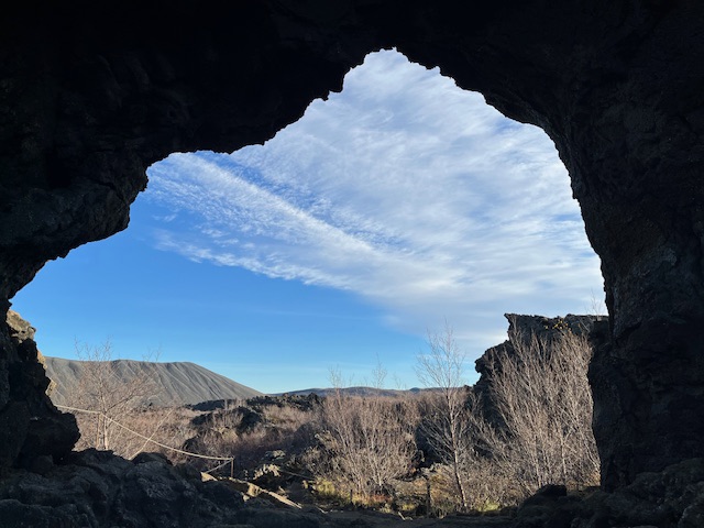 The Dimmuborgir area consists of a massive, collapsed lava tube formed by a lava lake flowing in from a large eruption in the Þrengslaborgir and Lúdentsborgir crater row to the East, about 2300 years ago.