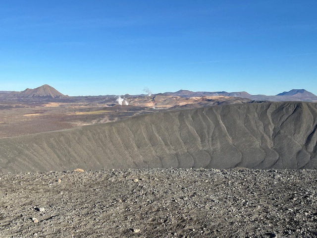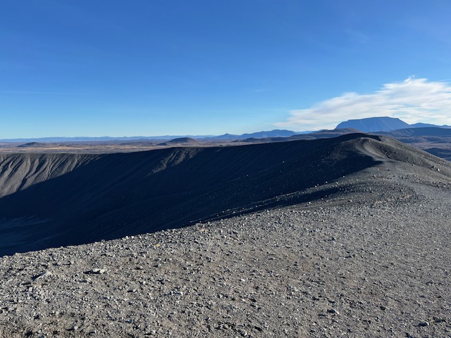 Hverfjell is a volcano with a wide crater of about a kilometre, known as a tuff ring, that erupted around 2500 BC. The highest point on the rim is 578 metres, meaning a steep ascent for me of about 250 metres.