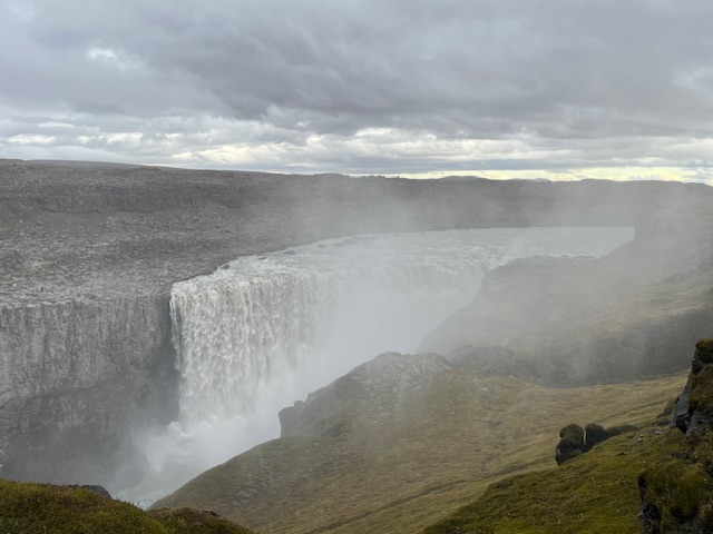The falls at Dettifoss are 100 metres (330 ft) wide and have a drop of 44 metres (144 ft) down to the canyon.