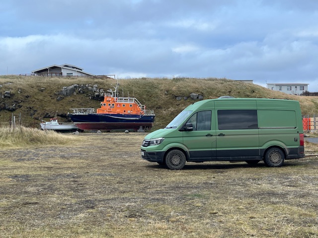 There is a campsite there, but it is closed for the season. There are so few vans prepared to stay without facilities that it is no problem to find a place. I sought one out of the wind, but that’s was impossible. Down at the sea was too wild, so I settled close to the hotel and met a Latvian guy in a rented Caddy who was about to head off, and I reassured him it would be no problem to stay. Caddy’s are great vehicles and I’ve seen some attractive conversions, but they are hard going in this weather. Also, his rental had hardly been renovated.. it had the thinnest of mattresses in the back, a portable cooking stove for outdoor cooking, and a small cooler box. No toilet or water container. A very basic leisure battery that was powered only by the engine, and used just for lights, to recharge devices and to start the diesel heater. He was a young guy, who was eating cold food most of the time. Some campsites have kitchens, but most are closed now. There’s very few residents in this village at this time of year, most places have closed, and no one was to bother about the occasional campervan staying overnight.