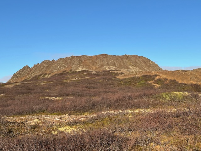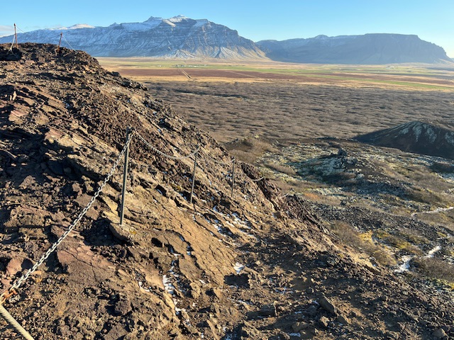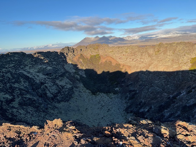 I left Snorrastaðir on Wednesday morning after a ten kilometre out and back hike to the Eldborg crater rim. Eldborg is a splendidly formed crater rising 60m above the surrounding lava. The spatter cone is the largest crater along a short volcanic rift, 200 m in diameter and 50 m deep. Its last eruption was about five to six thousand years ago.