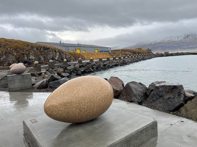 Before leaving Djúpivogur I was keen to see the eggs, and took a slow wander to them, just out of town, on a windy morning on Sunday. Djúpivogur had served me well. It is an attractive looking town, especially in the snow, and at this time of Yrsa, the little campsite is fine. It’s a few kilometres off highway 1 and attracts less of the mad rental market folk. I set my projector up in the common area next to the kitchen on Saturday, after a swim at their local pool. I had both places to myself, and managed a 100 inch / 250 cm screen on the white wall to watch the rugby undisturbed.