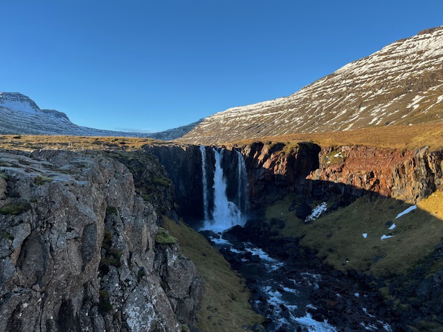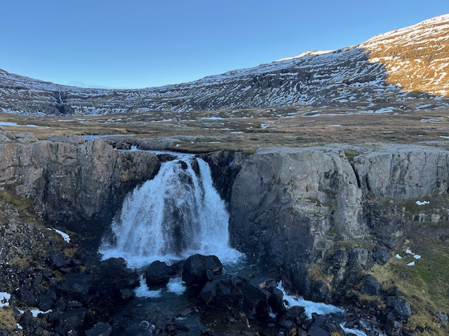 Yesterday, the Germans and I, drove over the pass to Seyðisfjörður together. There are cameras before you start the road that clearly show conditions on the plateau of the high point, at 700 metres asl, and although it was minus 6C, the road was clear of any snow. Some of the worst conditions arise when, though it isn’t snowing, high winds blow fallen snow across the roads, but this afternoon was also calm. We got out and took a few short walks during the journey also.
