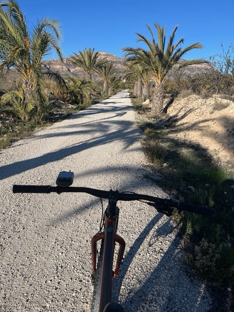 The following morning I rode the via verde, starting quite early at 9 am, as I had a few bits of business to attend to around the town of Elche, which I passed on the way south to my next destination, Ojós in the Segura valley, in the region of Murcia. There’s a place to stay just out of town next to the river and it’s weir that wouldn’t be possible in the summer, as it’s a swimming place also and would be busy, but on this night I was the only person there.