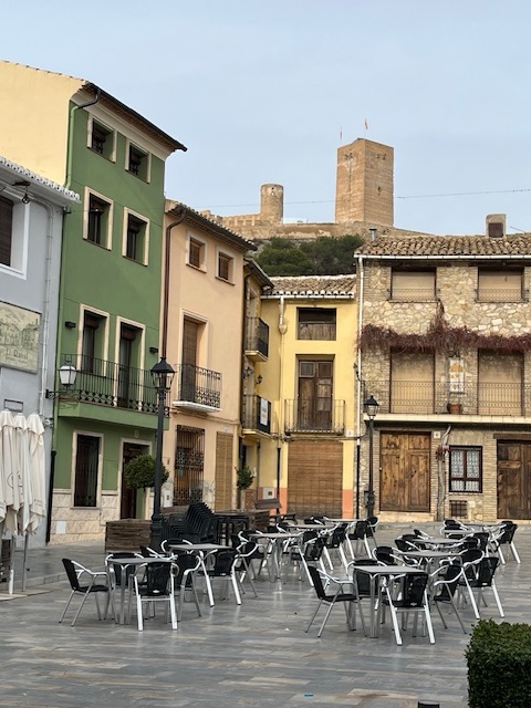 Being a weekend, the town of Biar was busy, and the aire became much sought after. There are about 16 well spaced places with free electric and water, and though it was only half full when I arrived on Friday lunchtime, there were vans waiting patiently for a space on Saturday morning. The town is attractive to visitors, with several little plazas with cafes, and its narrow streets meaning it has almost no vehicles. But the main attraction seems to be the free electricity. Many aires charge for a hook-up, but not here, hence its popularity. The big motorhomes can’t get enough power from solar energy, and they require quite a bit for heating and satellite television as well as the more urgent requirements. Most people just want to be away and sit in the motorhome watching TV, a break from using their own electricity back home. Mind you, I can hardly talk, having not paid an electricity bill for almost three years..